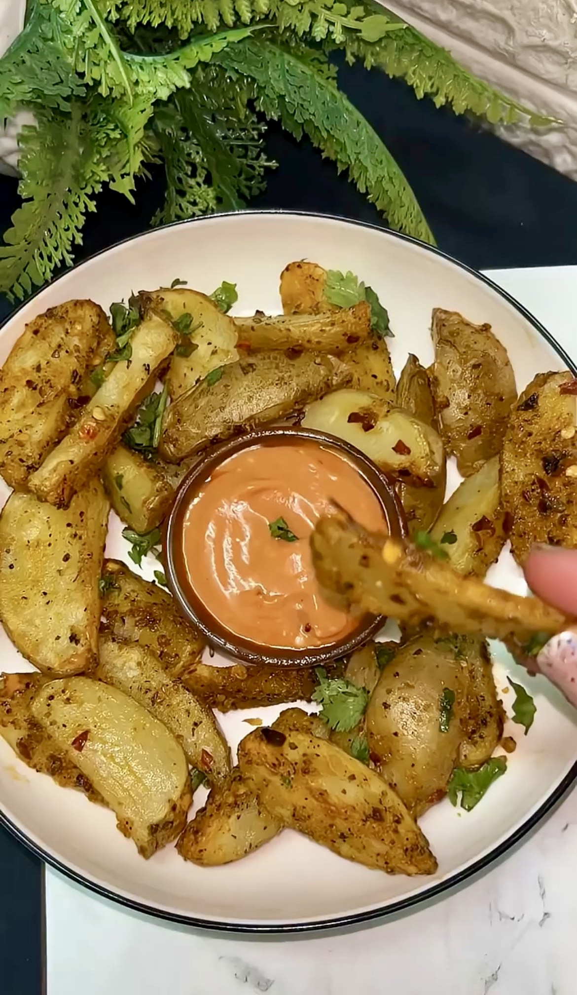 Q1: Can I make these potato wedges without an air fryer?Yes, you can bake them in an oven at 200°C for 25–30 minutes, flipping halfway for even crispiness. Q2: Do I need to boil the potatoes before air frying?